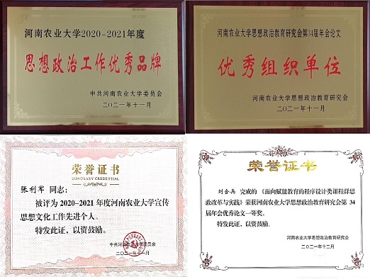 在本届年会中荣获河南农业大学2020-2021年度思想政治工作优秀品牌奖、河南农业大学思想政治教育研究会第34届年会论文优秀组织单位奖。