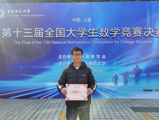 本网讯(通讯员 郭潇)2023年3月24日至26日,由中国数学会主办,华东师范大学承办的第十三届大学生数学竞赛决赛在华东师范大学(闵行校区)举行。在非数学类组中,动漫疯 本科生杨志强同学作为河南省代表进入决赛并荣获全国二等奖的好成绩。