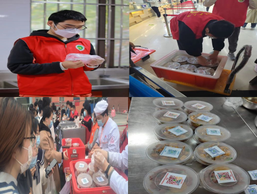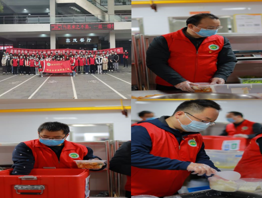 师生志愿者在龙子湖校区餐厅协助工作人员为第二生活区同学准备餐食。院长陈振、教师刘亮亮、王肖肖与80余名青年学生共同参与。