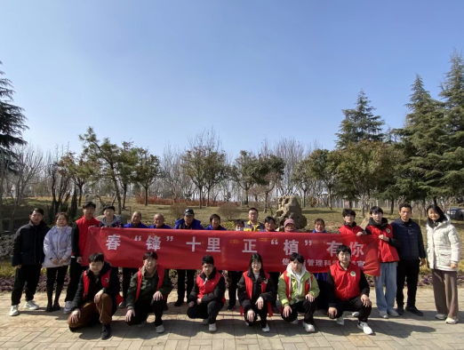 师生志愿者联合东越市政工程有限公司(以下简称东越市政)龙子湖公园工作人员共同开展“春‘锋’十里,正‘植’有你”植树节志愿种植活动,进一步传承和弘扬雷锋精神,为郑东新区龙子湖公园再添新绿。