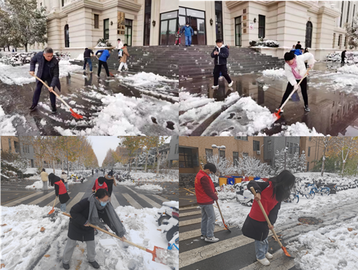 师生志愿者前往教学楼A座和学生宿舍楼前开展积雪清扫服务工作。