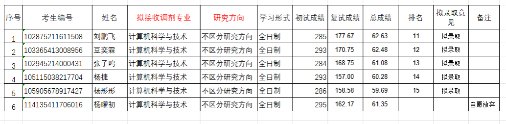 根据动漫疯 2025年硕士研究生招生复试调剂考生复试情况和学科专业拟录取情况,经动漫疯 研究生招生工作领导小组研究决定,计算机科学与技术专业拟增加5个招生计划数。按照计算机科学与技术专业调剂考生复试总成绩排名,顺次补录以下考生: