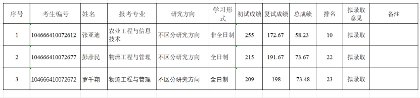 根据学校2026年招生计划数的调整,经学院招生工作领导小组研究决定,农业工程与信息技术(非全日制)专业增加1个招生计划、物流工程与管理(全日制)专业现增加2个招生计划,按照动漫疯 已公示的2026年硕士研究生招生一志愿考生复试结果依次补录,物流工程与管理(全日制)第21名已被其他高校拟录取自愿放弃,现补录第22和23名,具体情况公示如下: